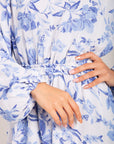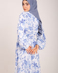 Refresh your wardrobe with this elegant blue floral maxi dress, perfect for spring and summer. Designed with modesty and comfort in mind, this dress features a flowy silhouette, full-length sleeves, and a flattering elastic waistband that offers both shape and ease.